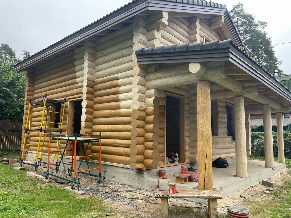 - Окраска и защитная обработка. После шлифовки следует окраска дома из бревна снаружи или обработка лазурью, маслами или антисептиками. Работы выполняются только в сухую погоду при температуре от +10 °C, иначе составы могут лечь неровно или потерять свойства.